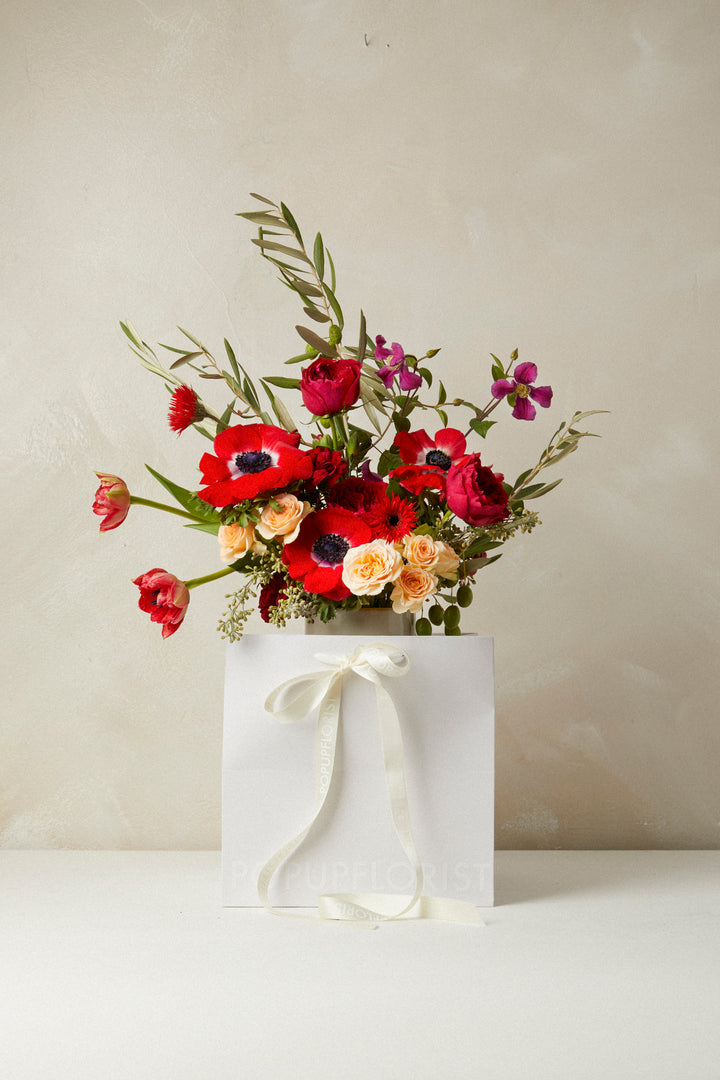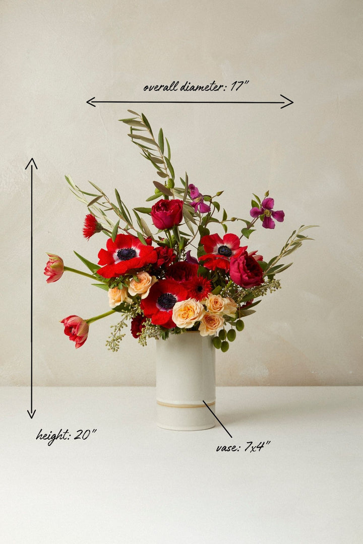 Pulling in the largest variety of our favorite, freshest blooms, this arrangement boasts of three times the stems in a taller, trendy ceramic vase.